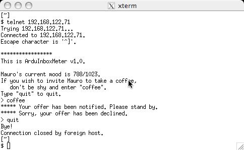 Should a friend want to have a coffee with me, he will telnet my ArduInboxMeter, enter βcoffeeβ, and wait for my response before quitting: